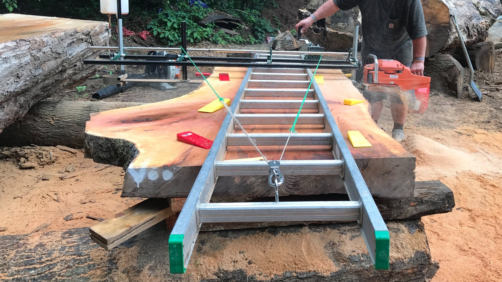 We designed and built our own router sled flattening jig. It is equipped with heavy duty linear bearings and a 3.5HP router. Our ‘manual CNC machine’ can accommodate slabs up to 5-1/2’ wide x 14’ long. We’ve come close a couple times, but we have yet find a 66” wide tree!