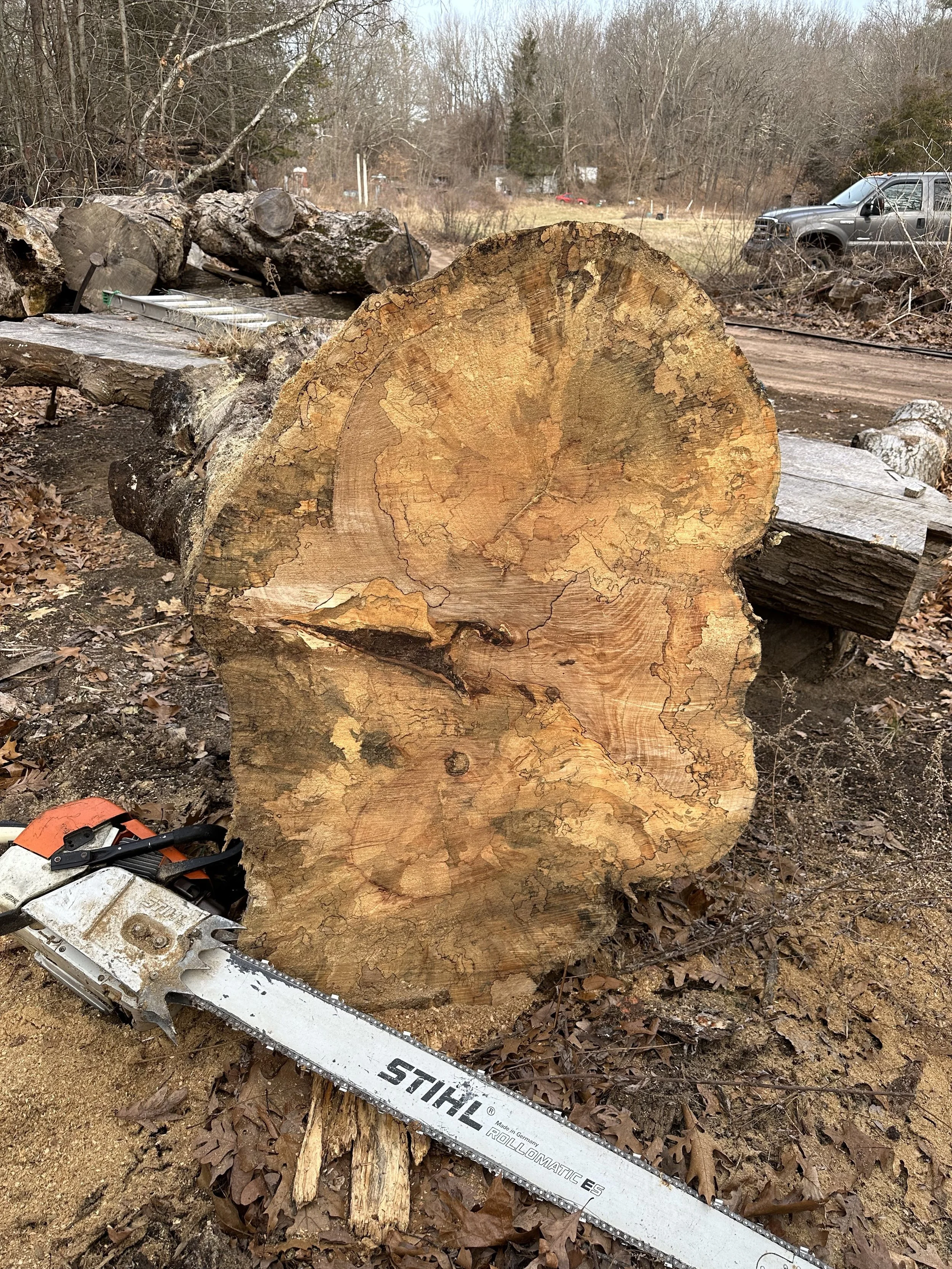 With a 6-foot chain saw and an Alaskan sawmill (from New England Pine of Granby, CT), we slice these monster sticks into 2-3” thick slabs. Every cut reveals the unique beauty within the log. You never know what you will find!